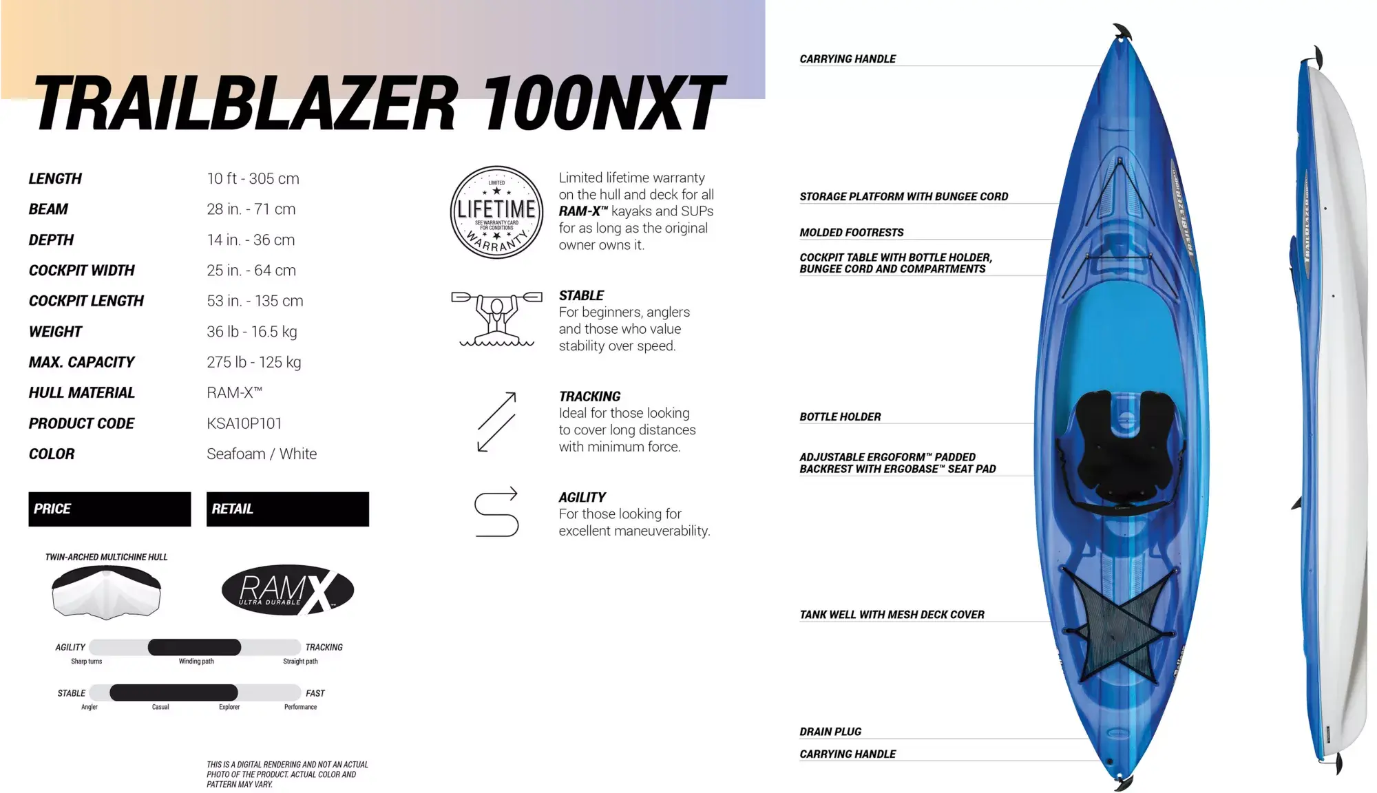 With an update on an old favorite. the Pelicani Trailblazer NXT Kayak boasts plenty of new features! Much like the original Trailblazer. the NXT is easy to paddle and very stable. making it perfect for beginners. This Next Gen boat features padded. comfortable seat and back. plus molded footrests for those long trips. You'll enjoy the cockpit table with bottle and accessory storage options.