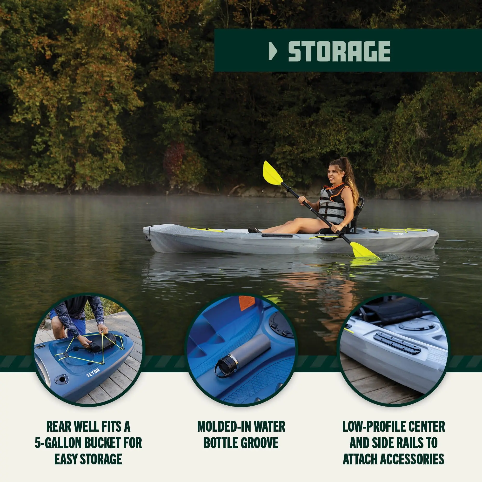 This kayak has several features that ensure an elevated. comfortable. and convenient user experience. The mesh. frame seat can be easily adjusted and removed while offering optimal comfort. The graduated footwells allow the paddler to choose the best foot positioning while paddling. Gear can be stored in the adjustable bow and stern bungees. The low-profile center and side rails enable the user to attach various accessories. Personal items can be kept secure in the dry storage hatch. which includes a molded-in water bottle groove. In addition. the kayak has dual paddle keepers and two built-in fishing rod holders. The rear well has enough space to accommodate a 5-gallon bucket for easy storage. The kayak is equipped with a removable drain plug and six self-bailing scupper holes. The multi-chine hull design provides excellent stability while navigating through waters. For easy transport. the kayak has convenient carry handles and luggage-style handles that allow for transport by one or more people