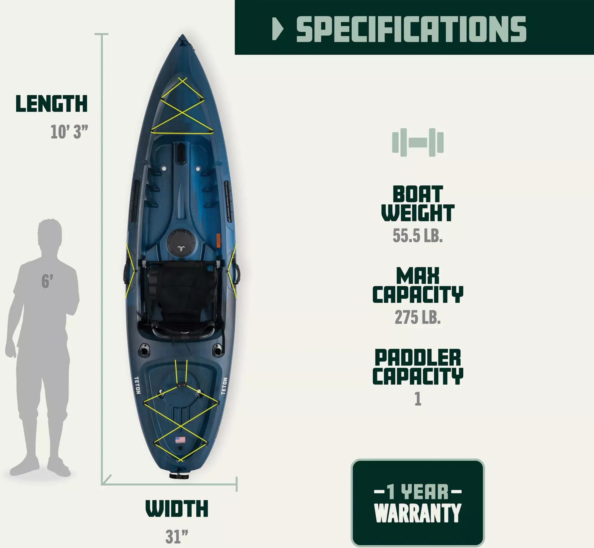 - Removable drain plug and 6 self-bailing scupper holes