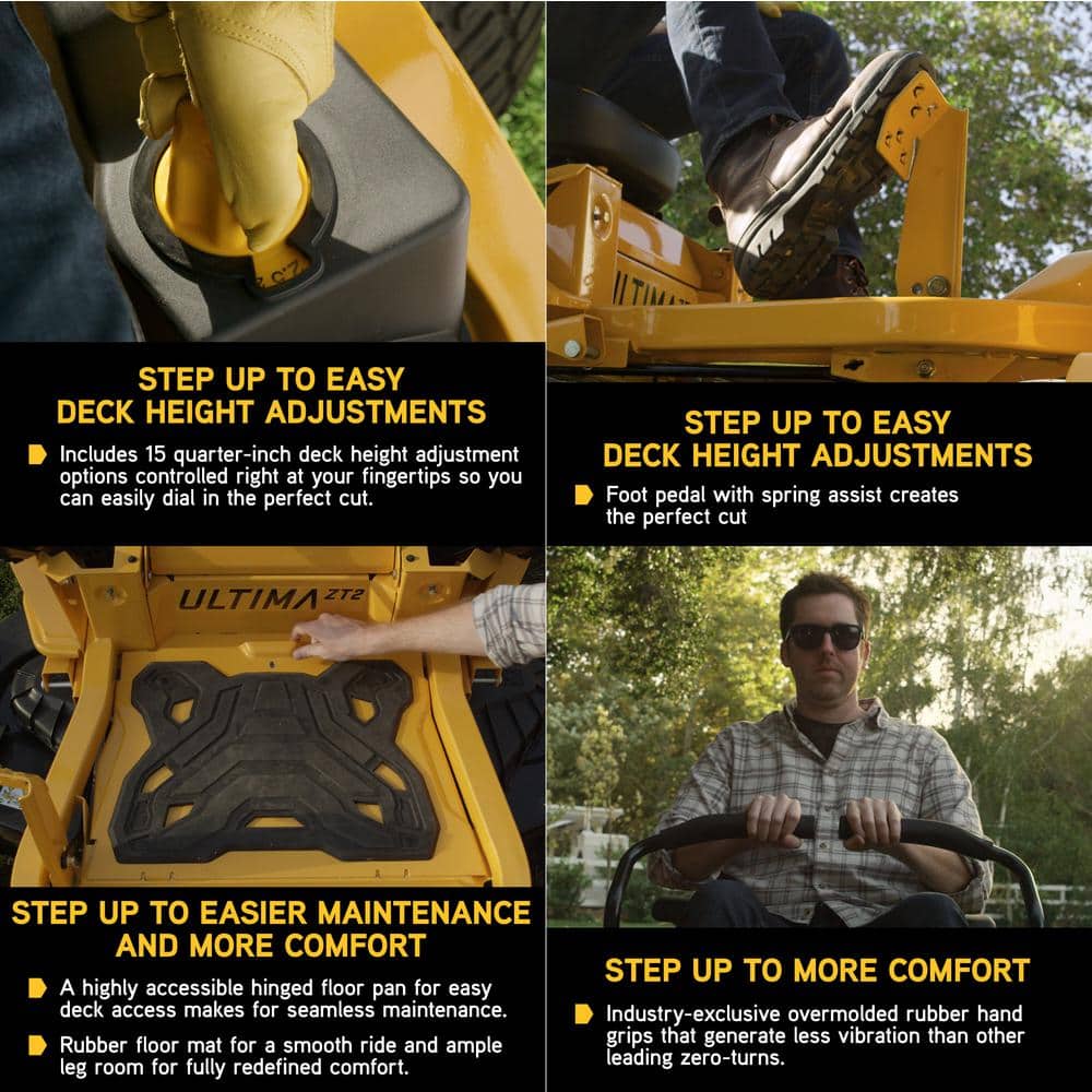 The ultimate all-around mowing experience now comes with professional-grade Synchro-Steer technology. providing 4-wheel control for unrivaled stability while mowing on hillsides and slopes up to 20°. The Cub Cadet ZTS1 46 zero-turn mower was engineered to be every bit as strong as its Ultima Series counterparts and features a 22 HP/725cc Kohler twin-cylinder engine that delivers high-performance power for a consistent cut. The 46 in. aeroforce fabricated deck features a cutting system that delivers a signature cut. with fewer clumps and stragglers. finer clippings and increased evenness of cut. A muscular. 2 in. x 2 in. tubular steel frame holds up against the toughest obstacles. A soft touch steering wheel and a steering column that tilts provides simple steering and greater handling on hills and uneven terrain. You'll ride in elite comfort with a 20 in. high back seat with a durable advanced polymer seat suspension. a rubber floor mat and ample leg room. A durable and compact AGM battery provides reliable starting season after season with a longer lifespan and less maintenance. Ideal for mowing hills and several obstacles up to 2 acres. Backed by a strong 3-year/unlimited-hour warranty. limited lifetime warranty on frame and deck and a nationwide network of Cub Cadet dealers for expert service and support. you'll get the ultimate mowing experience with the Cub Cadet Ultima Series.