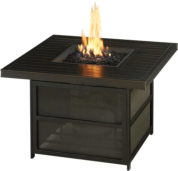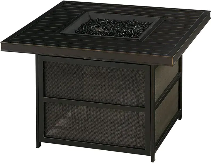 - 26 in. square fire pit table features an Alumicast tabletop with an oil-rubbed bronze finish