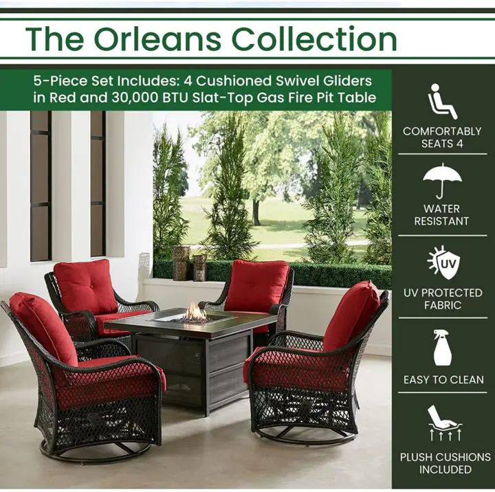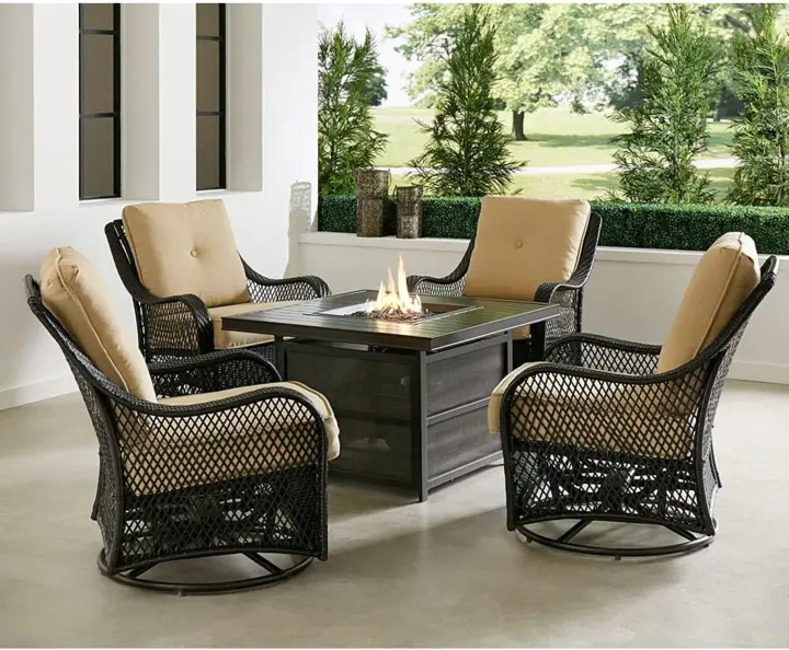 - Set includes 4 deep-seating swivel gliders and a 30.000 BTU fire pit table